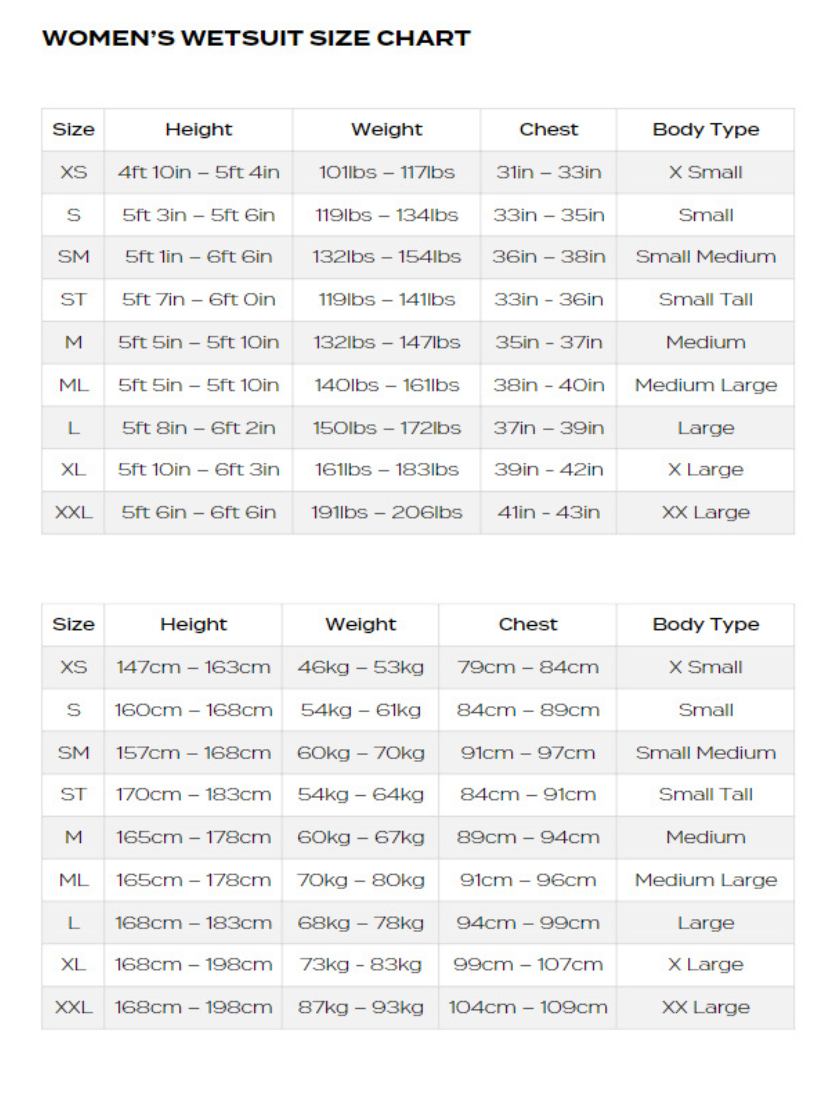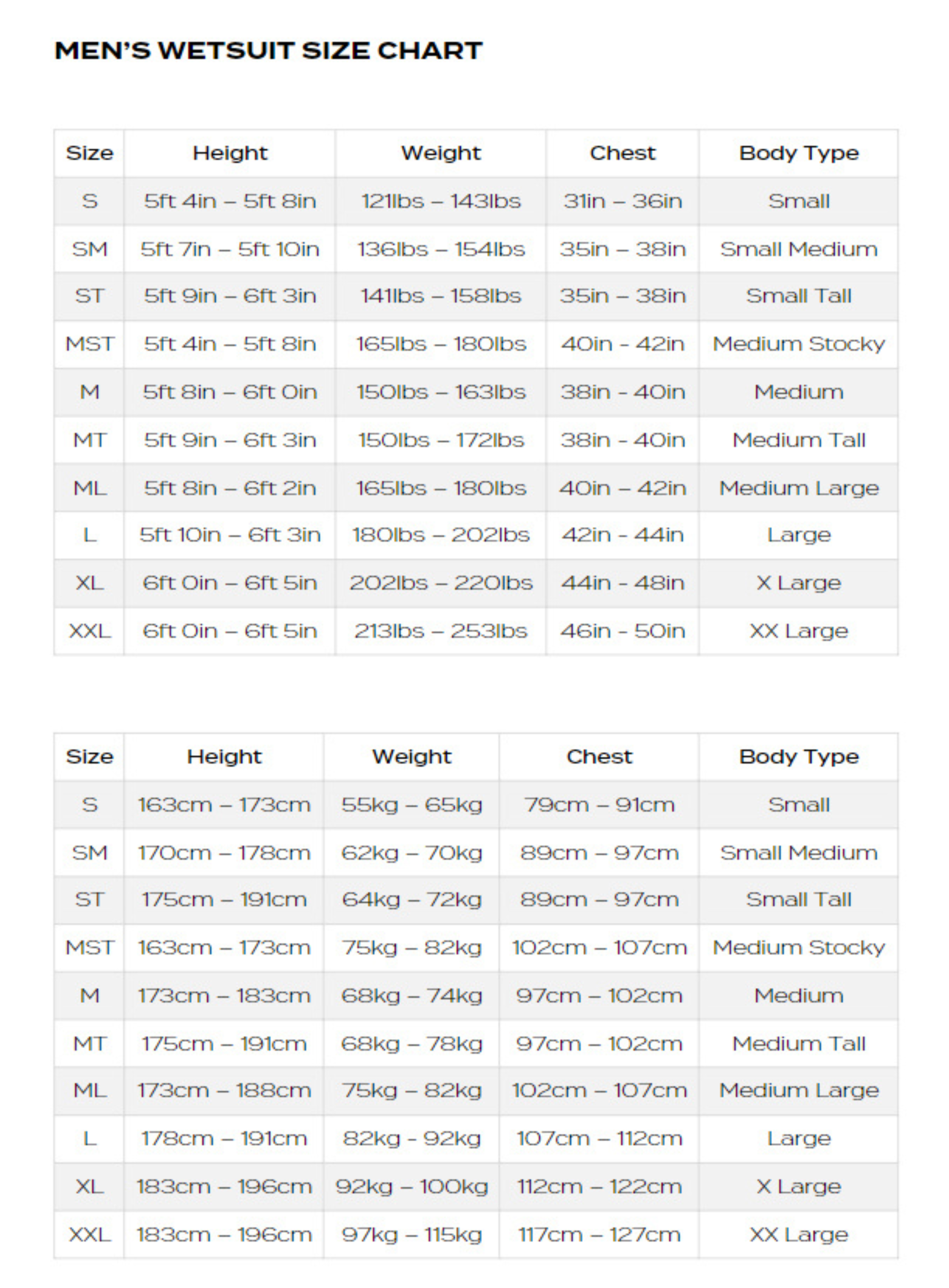 When booking your wetsuit for your Event use these size guides below to ensure you receive the correct size for you.